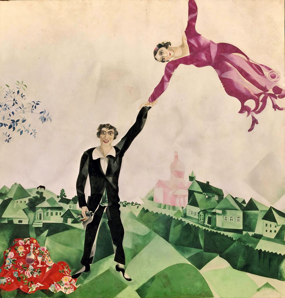 В 1914 году Шагал приехал в Витебск – повидать родных, а заодно и красавицу Беллу Розенфельд, с которой познакомился еще в 1909-м. Художник вспоминал об их первой встрече: «На бледном лице сияют глаза. Большие, выпуклые, черные! Это мои глаза, моя душа… Я вошел в новый дом, и он стал моим навсегда». В 1915-м они поженились, через год родилась их единственная дочь Ида. На картине «Прогулка» Шагал изобразил молодую жену парящей в воздухе. Тот же мотив полета есть и в работе «Над городом», правда, супруги проносятся над Витебском вдвоем, а под ними, как писал художник, виднеется «цепочка домов и будок, окошки, ворота, куры, заколоченный заводик, церковь, пологий холм (заброшенное кладбище)». На третьей картине помимо Шагала с женой изображен ангел – считается, что это маленькая Ида, символизирующая святость их любви. Работы, составляющие триптих, волею судеб оказались разделены: «Прогулка» сегодня хранится в Русском музее, «Над городом» – в Третьяковской галерее, а «Двойной портрет с бокалом вина» (1918) – в Центре Жоржа Помпиду.