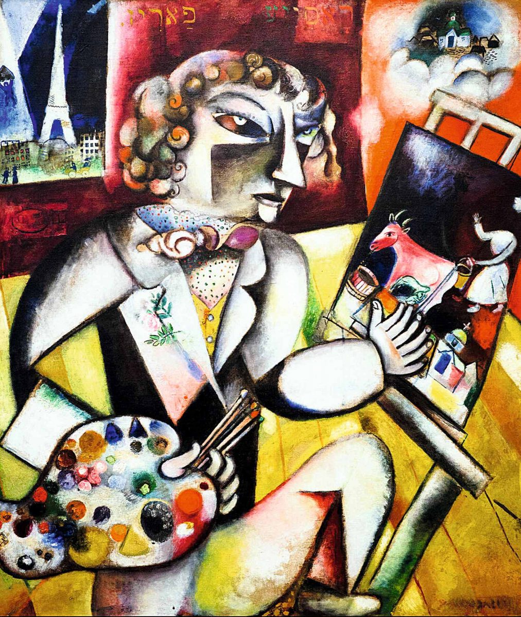 «Витебск – это место особое, бедный, захолустный городишко», – писал Шагал в мемуарах о городе, где вырос и который с щемящим чувством вспоминал на протяжении всей жизни. Родившийся в 1887 году в семье приказчика, он получил традиционное еврейское образование, но внезапно для родных решил стать художником и в 1907 году отправился покорять Петербург. Сначала учился у Николая Рериха в Рисовальной школе Общества поощрения художеств, о котором писал: «Наш директор Рерих сочинял неудобочитаемые стихи… и часто с улыбкой, не разжимая зубов, читал зачем-то всем подряд, даже мне, ученику, пассажи, в которых я ничего не мог понять». Потом занимался у Льва Бакста в частной художественной школе Званцевой. Но каждый раз убеждался, что ничему новому его не учат. В 1911 году Шагал набрался смелости и отправился в мировую художественную столицу – Париж. Именно там он написал картину «Я и деревня», когда затосковал, несмотря на ослепительный блеск Франции, по родным местам.