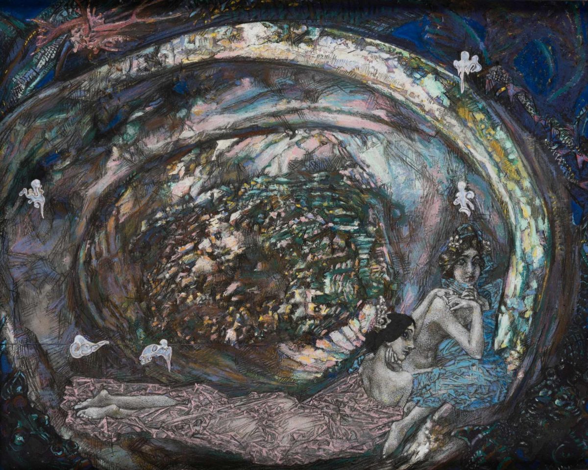 Особого внимания заслуживают произведения Михаила Врубеля. Его обращение к пастели было коротким, но подарило миру шедевры. «Жемчужина» (1904) уникальна по технике: художник обращается к аппликации, создает сложные наслоения бумаги, добиваясь трехмерного рельефа, словно соревнуясь с природой.