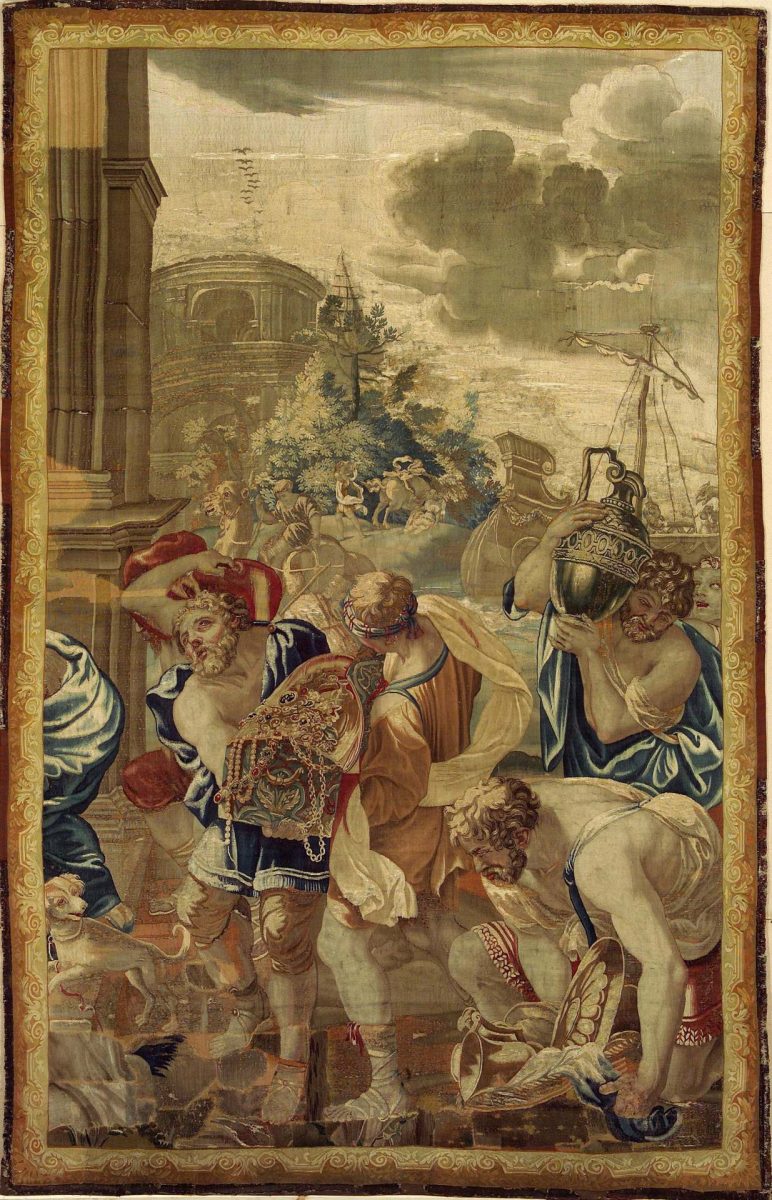Эпоха XVII столетия представлена на выставке двумя произведениями: парижской шпалерой «Похищение Хариклеи», созданной по композиции первого живописца короля Симона Вуэ и фрагментом брюссельской шпалеры «Разгрузка корабля» по проекту французского художника Шарля Франса Поэрсона.