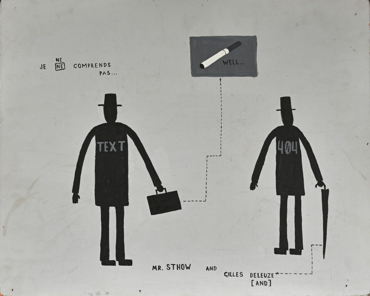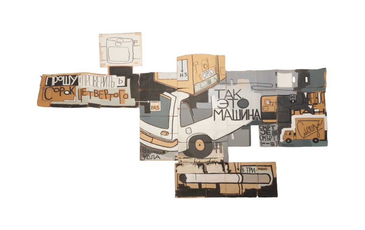 Помимо живописи и графики, на выставке демонстрируются объекты, среди которых следует отметить подборку стульев и скейт 2010-х годов. Большую часть экспонатов составляют работы с узнаваемыми ироничными и порой абсурдными фразами на русском и иностранных языках. Войдет в экспозицию и знаковая работа «В моем случае – ни в коем случае», давшая название одноименной выставке 2016 года в ММОМА.
