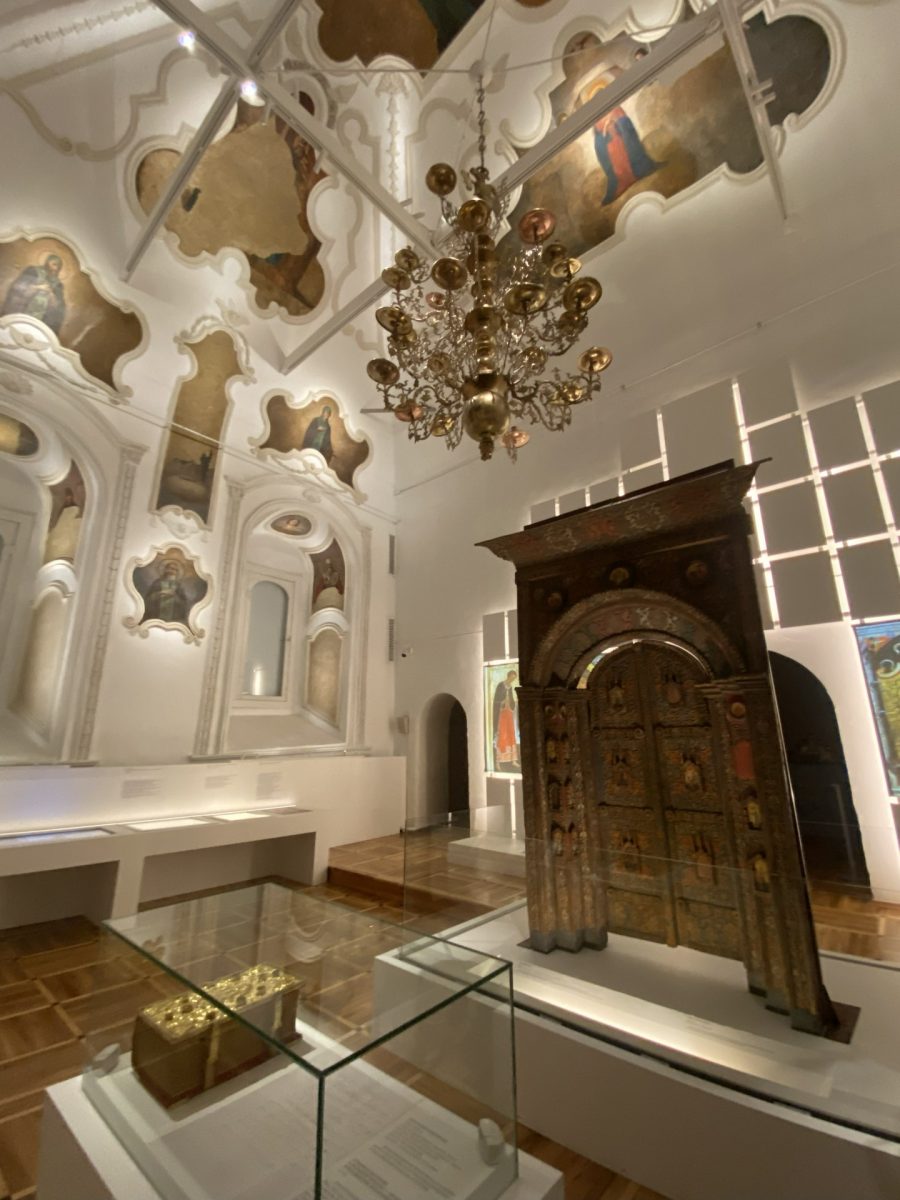 Здесь, в одном небольшом пространстве собраны мемориальные предметы XVII века, связанные с самим князем и его ближайшими родственниками. Это иконы, драгоценные металлы и камни, металл, оружие, нумизматика, белый камень, скульптура и многое другое. Конечно, особый интерес вызывают личные вклады Пожарских в монастырь: рукописное евангелие в окладе с драгоценными камнями, паникадило, резные Царские врата. А еще – фелонь, сшитая из шубы Дмитрия Михайловича Пожарского. Все это исключительно подлинники.