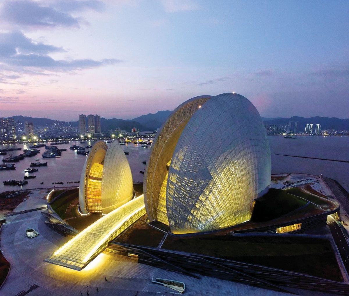 Один из самых красивых оперных театров мира расположен в китайском городе Чжухай. Это первый в стране театр, построенный не на материковой части, а на острове – он называется Ели. Автор проекта – Чэнь Кэши, профессор Школы городского планирования и дизайна Пекинского университета. Здание стоит на берегу Чжуцзян, или Жемчужной реки – отсюда его архитектура, вдохновленная водной стихией. Комплекс представляет собой две полупрозрачные ракушки высотой 90 м и 60 м. В одной – большой зал на 1,5 тыс. человек, в другой – на 500. В интерьерах театра использованы натуральные материалы, преимущественно дерево, а стены в залах имеют неровный рельеф, напоминающий морские волны. Театр открылся для зрителей в 2017 году, став новым культурным центром всего региона.