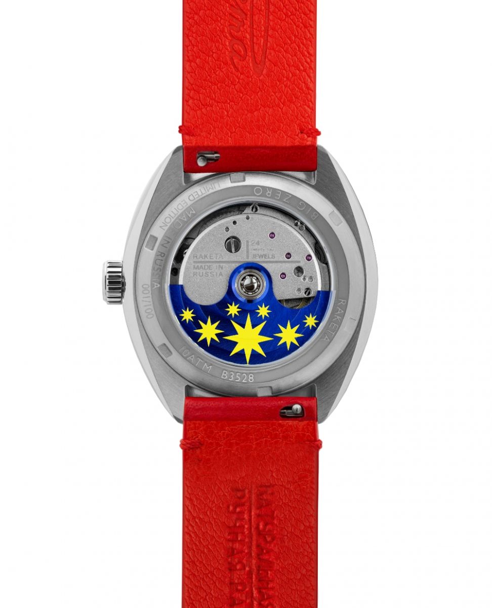 Коллаборация Янковской и часового бренда «Ракета» стала соединением художественного высказывания и инженерной традиции. В дизайне часов использован фирменный красный цвет Янковской, который является знаковым и для «Ракеты». В той же гамме выдержан и ремень из натуральной кожи (в комплект входит классический черный ремешок из кожи аллигатора). В центре циферблата – вращающаяся звезда, элемент живописного языка художницы, отсылающий к картине «Звезда» из серии «Таро». Образ звезды вступает в диалог с темой космоса, исторически значимой для часового бренда, появившегося на свет благодаря триумфальному полету Юрия Гагарина.
