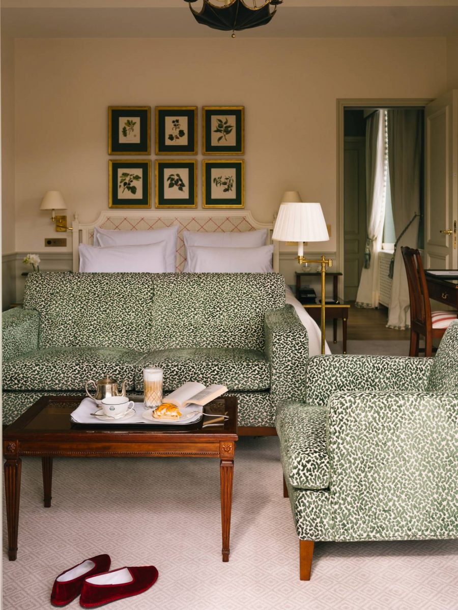 Эстетика уникальных дизайн-концепций для номеров отеля навеяна стилем Beaux-Arts XIX века и английскими интерьерами: богато украшенный текстиль, антикварные письменные столы, изготовленные на заказ комоды от местных мастеров. Цветовая палитра включает мягкие коралловые, зеленые, пудрово-голубые и кремовые оттенки. Ткани и обои от таких знаковых домов, как Colefax and Fowler, Pierre Frey и De Gournay, придают интерьерам теплоту и фактуру. Особенное внимание уделено историческим деталям: бережно сохраненные деревянные балки XIX века впервые предстали перед публикой.