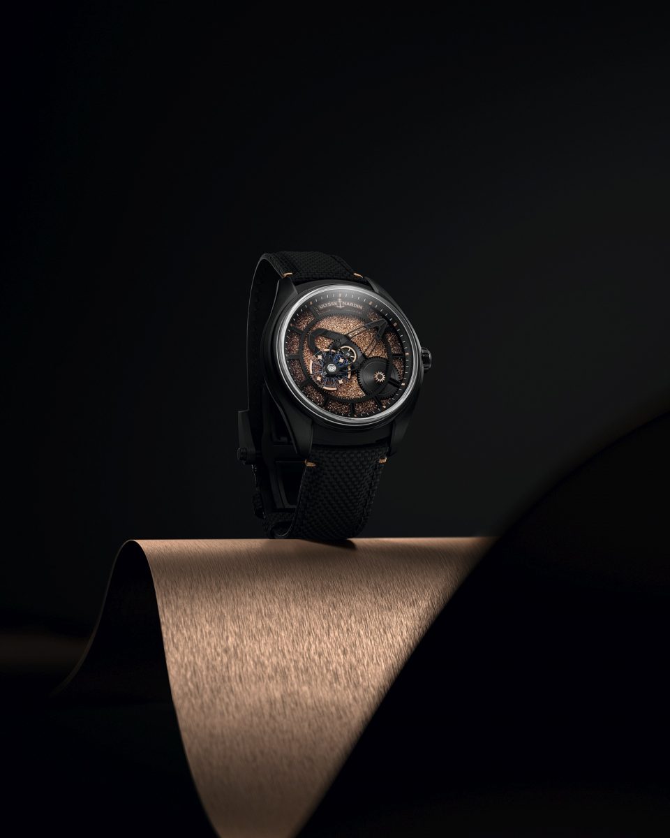 Мануфактура Ulysse Nardin выпустила модель Freak X Crystalium. Название и зернистая поверхность циферблата модели наводят на мысли о минералах, однако в действительности покрытие вовсе не кристаллическое. Все дело в диске из рутения, который в течение нескольких дней подвергается PVD-обработке, формирующей структуру, напоминающую кварц. Затем она покрывается слоем розового золота. Часовая стрелка крутится вместе с золотистой платформой-основанием, минутная формируется всей платформой с регулятором и спуском, создавая характерный для коллекции эффект «парящей» карусели.