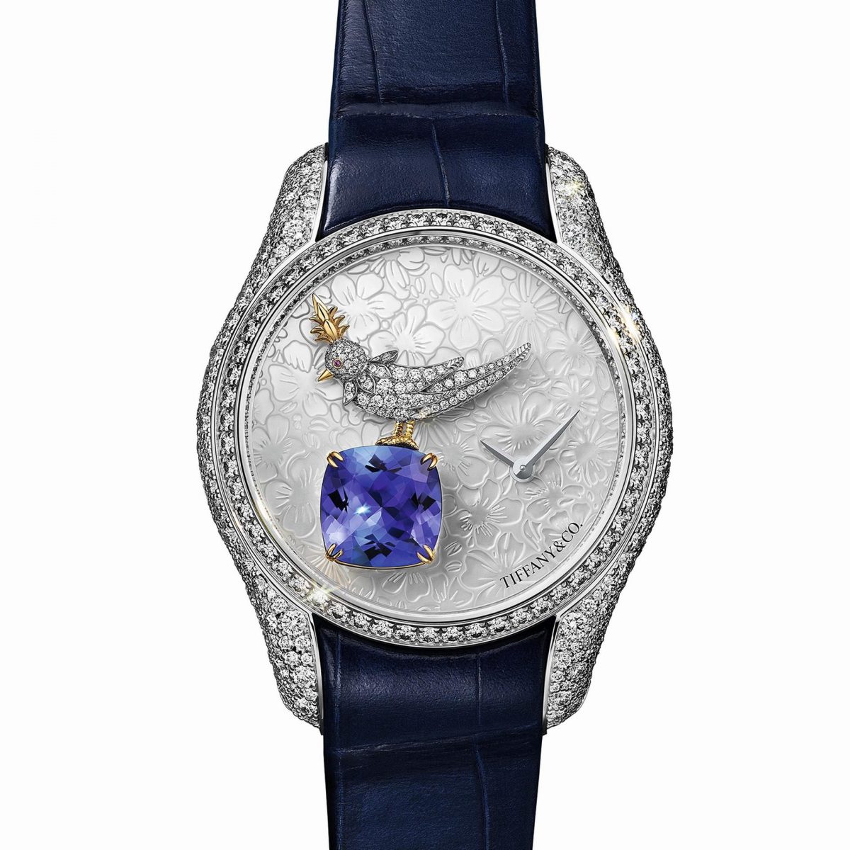 Tiffany & Co. вновь интерпретировала культовую брошь 1965 года работы Жана Шлюмберже, одного из величайших ювелирных дизайнеров всех времен. Сегодня его хрупкая птичка перемещается на циферблат изящных дамских часов Bird on a Rock Legacy Tanzanite, в центре которого закреплен танзанит весом 2,72 карата огранки «кушон». Даже крапаны, удерживающие камень, выглядят как птичьи когти. Корпус диаметром 36 мм украшен бриллиантами в технике «снежной» закрепки, на которую у мастеров уходит около 55 часов работы. Инкрустация же золотой птицы 119 бриллиантами и розовым сапфиром занимает более суток. Окошко с увеличительным стеклом на задней крышке позволяет рассмотреть скрытую красоту камня.