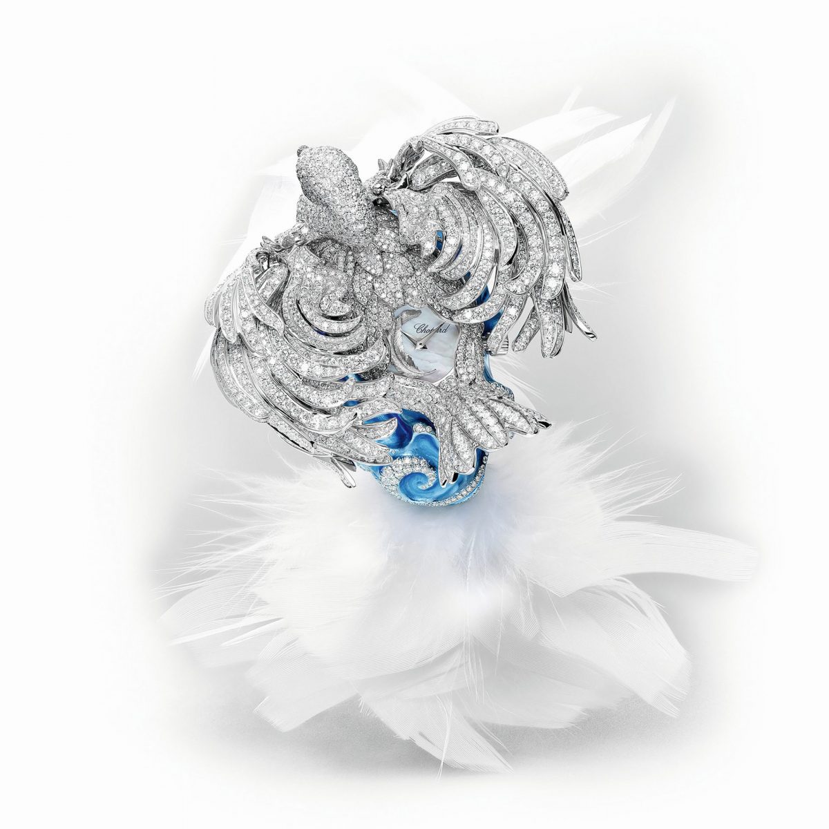 Дом Chopard продемонстрировал безупречное мастерство, пополнив миниатюрный «бестиарий» секретными часами Swan Lake. Уникальная модель стала результатом более чем 1500 часов исследований, разработок и ручного труда. Шедевр, изготовленный из «этического» белого, желтого золота и титана, инкрустирован россыпью драгоценных камней общим весом 35,09 карата. Когда голова лебедя переводится в центральное положение, запускается настоящий механический спектакль: крылья из трех подвижных секций постепенно распахиваются, и взгляду предстает миниатюрный перламутровый циферблат. На запястье часы закрепляются атласным ремешком, украшенным белыми перьями и застегивающимся на пряжку в форме пера.
