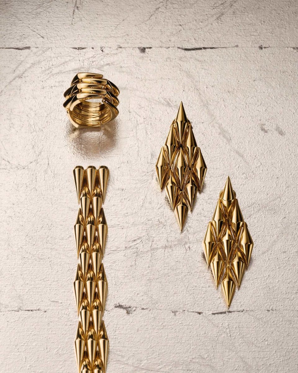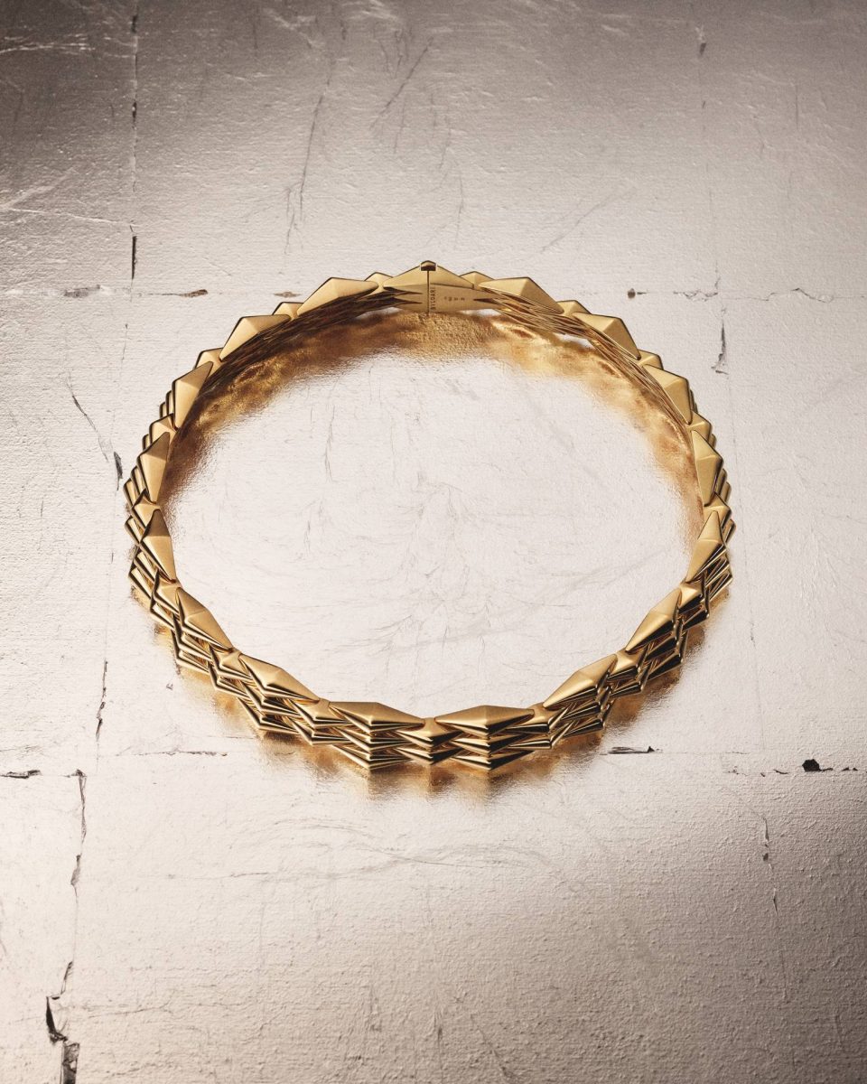 Ее первая глава Vimini вдохновлена архивным браслетом 1942 года из чистого желтого золота. Характерное плетение его звеньев напоминало традиционную технику изготовления корзин и других бытовых предметов из ивовых прутьев. Исторический браслет выступил прямым прообразом современного: ромбовидные элементы из чистого желтого золота идеально ложатся на кожу, соединенные невидимыми гибкими креплениями.