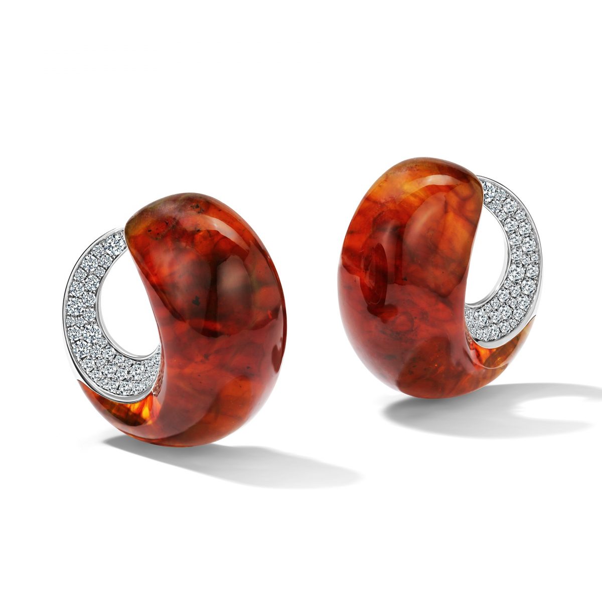 Теперь в «Янтарной комнате» появилась еще пара предметов с бриллиантами. Объемные серьги плавно закручиваются вокруг мочек ушей, а кольцо – вокруг пальца. Их извилистая форма сложна на этапе 3D-моделирования, и у ювелира за верстаком на изготовление одного украшения уходит до 72 часов. Каждый фрагмент янтаря вырезается методом фрезеровки, но подгоняется к основе из палладиевого белого золота индивидуально вручную. В технике корнеровой закрепки непосредственно в металл инкрустированы бриллианты: 88 камней в серьгах и 90 – в кольце.