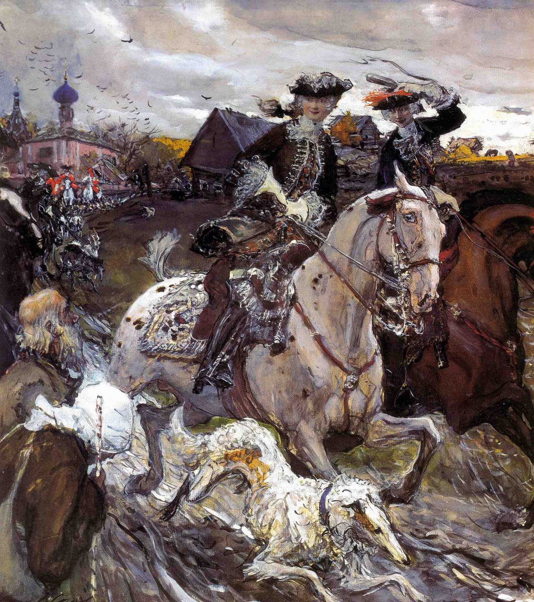 Классическая русская псовая охота всегда была культурным феноменом усадебного быта. Столько в ней сформировалось правил и ритуалов, что добыча отходила на второй план, главным становилось само действо, почти театрализованное. Чего стоили одни только охотничьи наряды аристократии, особенно женские (для того, чтобы ездить в дамском седле, шили платья покроя «амазонка»: в седле с двумя луками и одним стременем с левой стороны сидели боком, поэтому юбка была асимметричной)! Полевые условия, но сплошь бархат, атлас, белые кружевные манжеты и вуали. Для охоты содержали специально тренированных лошадей и целые своры собак, причем гончих в стае подбирали и по рабочим качествам, и по голосам, такой «хор» был предметом гордости владельца. Даже лексикон появился особый – лингвисты насчитали в охотничьем словаре не менее 500 слов, например, для разных животных существовало свое название хвоста: у гончей он именовался гон, у борзой – прави́ло, у легавой – прут или перо, у волка – полено, у лисы – труба, у зайца – цветок или пых.