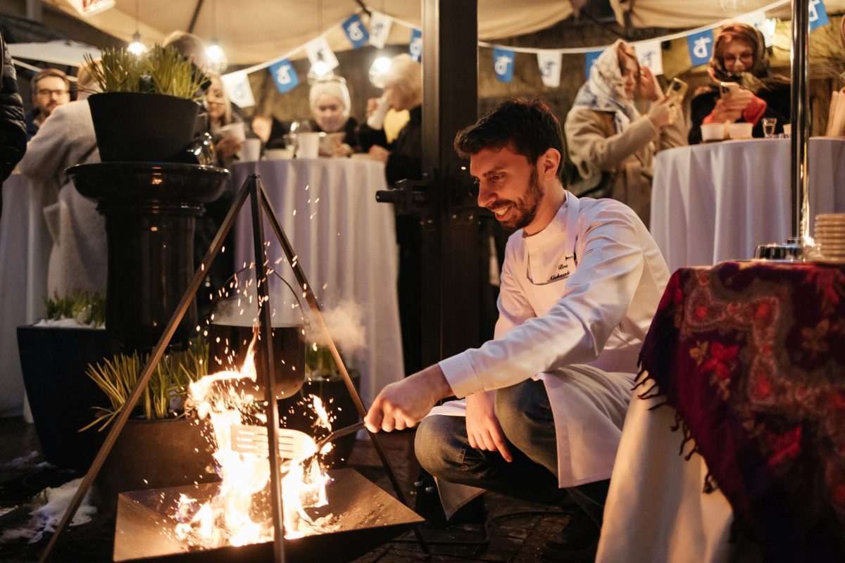 За меню и напитки в этот вечер отвечают рестораны Cafe Claret, «Огородники», «Сыроварня», «Катюша» и бары Gastronom и «Искристый бар». Александр Богданов (Cafe Claret) приготовит для гостей тазик домашнего оливье, пирожки с хвостами и наваристым супом из пяти видов грибов. Александр Карюкин («Сыроварня») отвечает за классику – сельдь под шубой, которую он подает с крабом и щучьей икрой, и бефстроганов с печеным картофелем и сыром. Роман Васильев («Катюша») считает, что лучший способ согреться в зимний день – щи с квашеной капустой. А Константин Колосов («Огородники») приготовит голубцы с креветкой и красной икрой, борщ с копченой грушей и картофельным пирожком. На станции «Искристого бара» гостям без ограничений будут наливать игристое вино и глинтвейн.