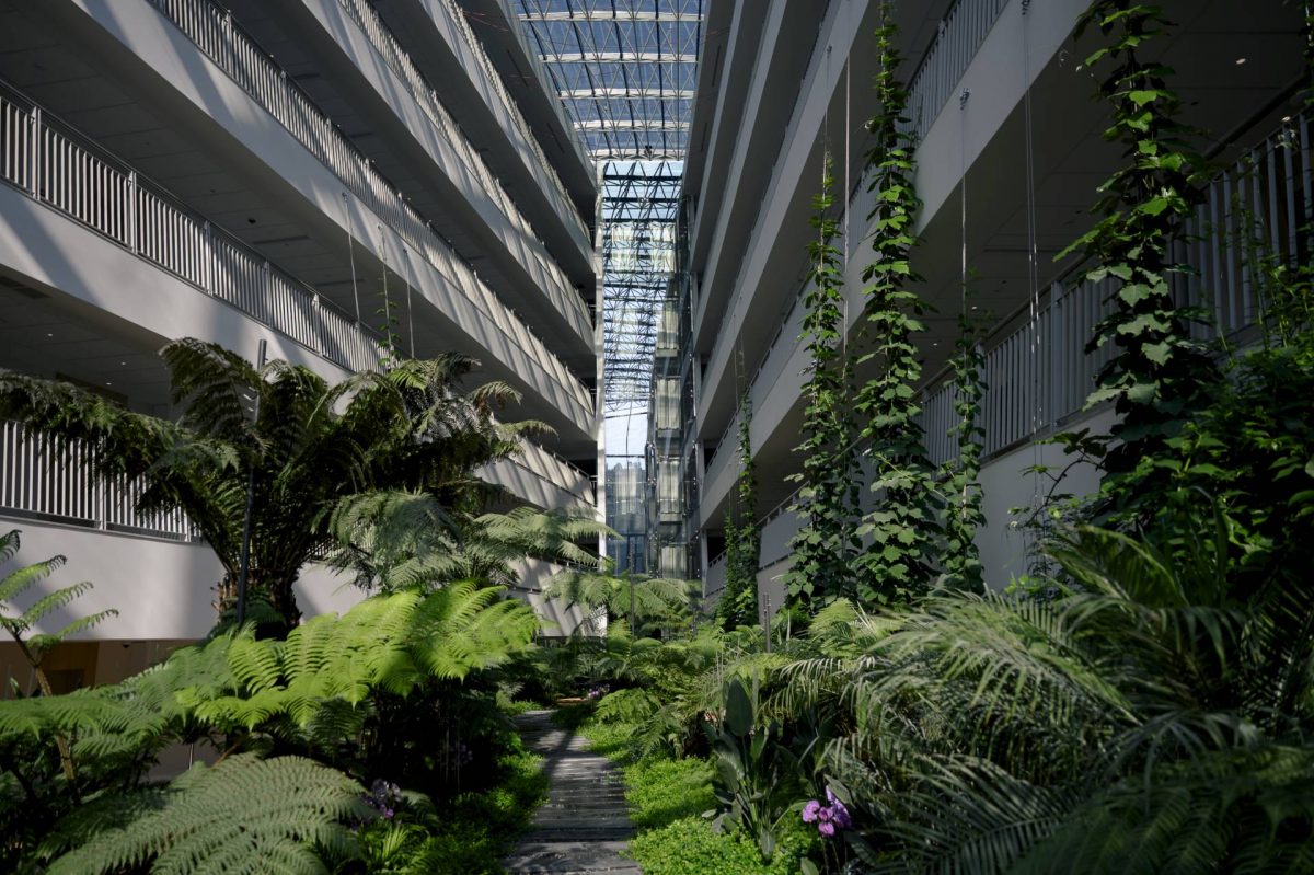 Футуристический облик здания с плавными линиями и каскадными балконами представляет собой современную интерпретацию древних террасных ландшафтов Хосты. Оно следует естественным изгибам местности, создавая эффект единства с окружающим пейзажем. Зеленые маршруты для терренкура и просторный атриум с зимним садом, где представлено 20 видов тропических растений, усиливают эффект полного погружения в природу.