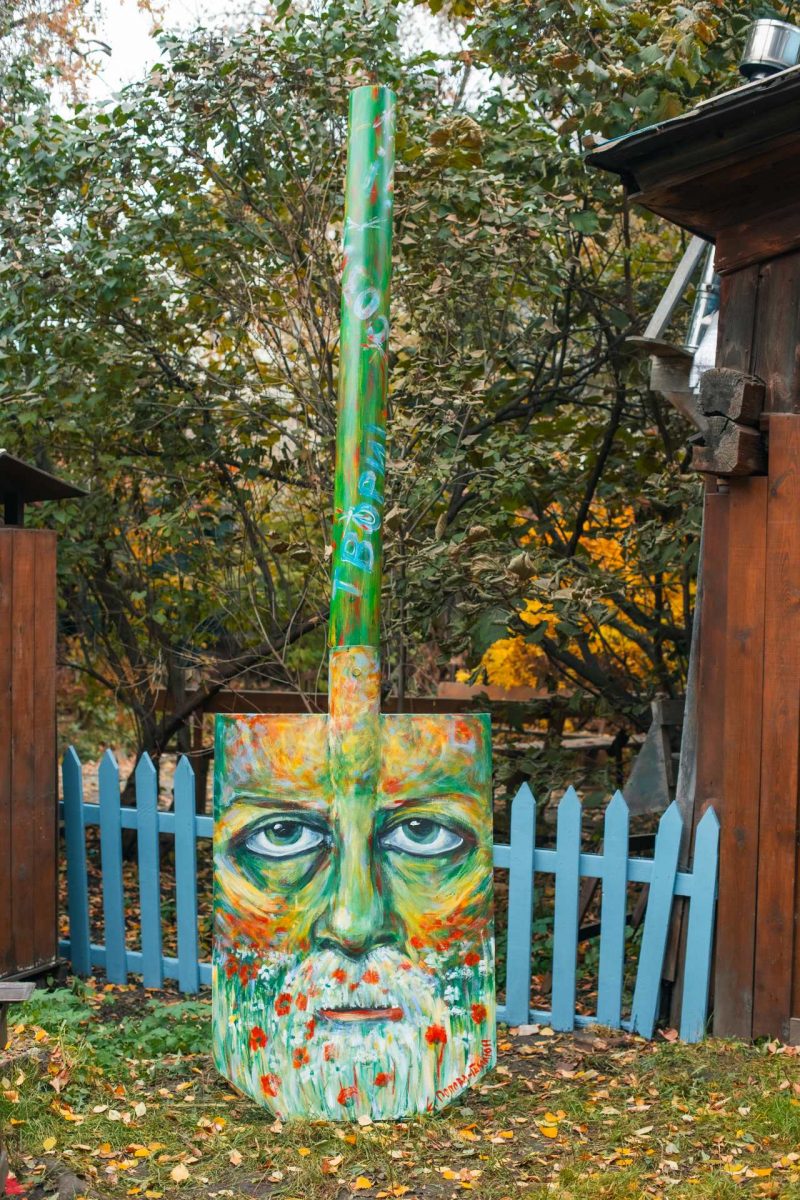 Инициатором преображения сада великого сказителя земли уральской выступила Екатерина Попова-Гамаюн – художник, дизайнер, журналист. Специально для дома-музея Бажова она создала портрет Павла Петровича на огромной лопате и инсталляцию на лопатах «Быть Бажовым» – это несколько портретов Павла Петровича, каждый из которых представляет собой букву из имени писателя. Эти портреты Екатерина привезла в Екатеринбург из Москвы в дар музею и в благодарность Павлу Петровичу за его творчество.