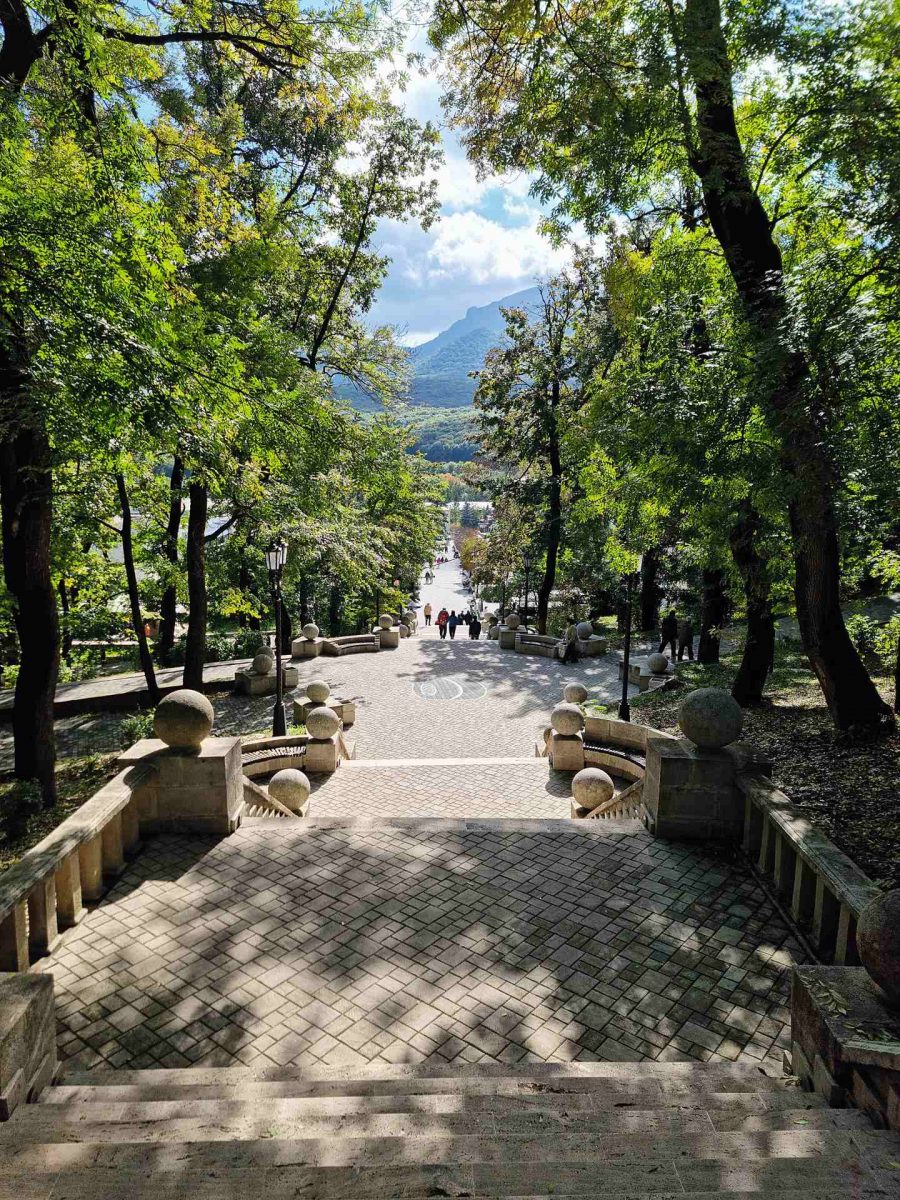 Если время ограничено и среди курортов Кавминвод нужно выбрать лишь один, альтернативы Кисловодску не найти – просто потому, что в «русском Баден-Бадене» есть все и сразу. На Курортном бульваре – будто обнимающее тебя дворцовое здание Главных нарзанных ванн, где оздоровительным купаниям в нарзане предавался сам император Николай II. Пару минут – и наступает «новая эпоха»: соседние не менее популярные Октябрьские ванны были названы в честь юбилея революции и предназначались для лечения ее творцов и непосредственных участников. Еще два шага – и попадаешь в отреставрированную неоготическую Нарзанную галерею, построенную в середине XIX столетия уже упоминавшимся Самуилом Уптоном: тут есть холодные и теплые, общий, доломитный и сульфатные источники нарзана (это слово произошло от балкарского «нартсанэ», «напиток богатырей»).